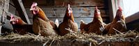 Een sfeervol tafereel ontvouwt zich in deze panoramische weergave van vijf kippen die het bruisende hart van een boerderij vormen. De stal, doordrenkt met warme aardetinten, vangt het dagelijkse leven van deze pluimveefamilie op levendige wijze. De kippen, getekend door hun dagelijkse avonturen, stralen een natuurlijke gratie uit te midden van het landelijke decor. Hun veren, doorgroefd door de zonnestralen die door de kieren van de stal vallen, stralen een prachtig scala aan kleuren uit. De nieuwsgierige blikken van de kippen vangen het alledaagse boerderijleven in één moment. Een verstilde, doch levendige weergave die de rustieke charme van het boerenbestaan in zijn volle glorie toont, perfect voor aan de muur van iedereen die de eenvoudige schoonheid van het platteland koestert. Prachtige foto gemaakt door AI.