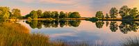 Een weids 3:1 panorama beeld van een zonsondergang aan het Moddergat in Nationaal Park Dwingelderveld, het grootste natte heidegebied van West-Europa. Gelegen in de Nederlandse provincie Drenthe, in de driehoek Dwingeloo, Ruinen en Beilen. Natte laagtes en hoge zandruggen wisselen elkaar af in het uitgestrekte Dwingelderveld.