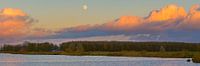 Een weids 3:1 panorama beeld van een zonsondergang en maanopkomst in het natuurgebied, ’t Roegwold, gelegen aan het Dannemeer nabij het dorp Schildwolde in de provincie Groningen.