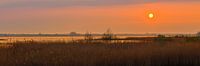 Een weids 3:1 panorama beeld van een zonsondergang aan het Zuidlaardermeer, een 540 ha groot meer met daarnaast nog 120 ha aan oeverlanden, ten noorden van Zuidlaren en ten zuidwesten van Hoogezand.