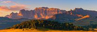 Een weids 3x1 panorama beeld van een zonsopkomst op Alpe di Siusi (Duits; Seiser Alm), een Dolomietenplateau en de grootste alpenweide op grote hoogte van Europa. Alpe di Siusi ligt in de Italiaanse provincie Zuid-Tirol in het Dolomietengebergte.