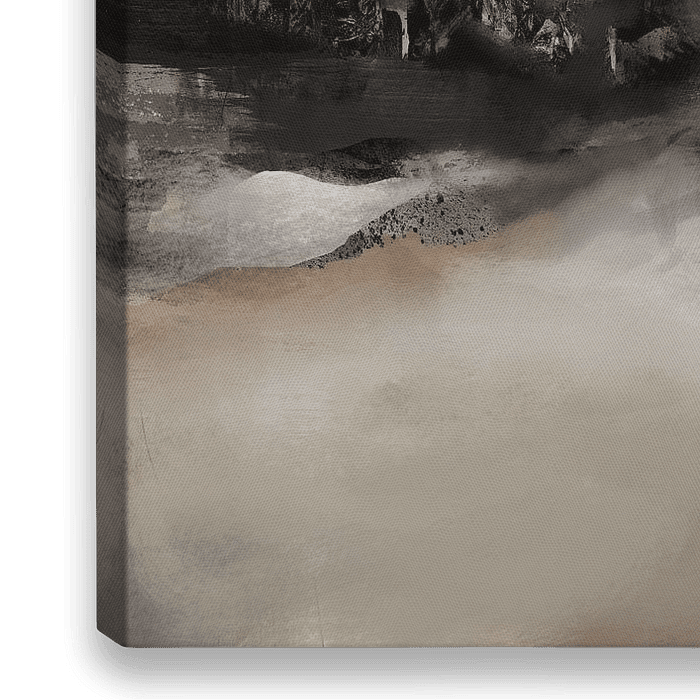 Panoramisch landschap met zwart-bruine tinten en sterke textuur.