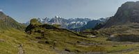Blik op Eiger Monch en Jungfrau vanuit het Kiental in het Berner Oberland in de Zwitserse Alpen.
