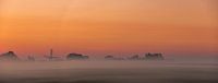 Panoramafoto van het platteland op een miste ochtend tijdens zonsopkomst met prachtige kleuren in de lucht