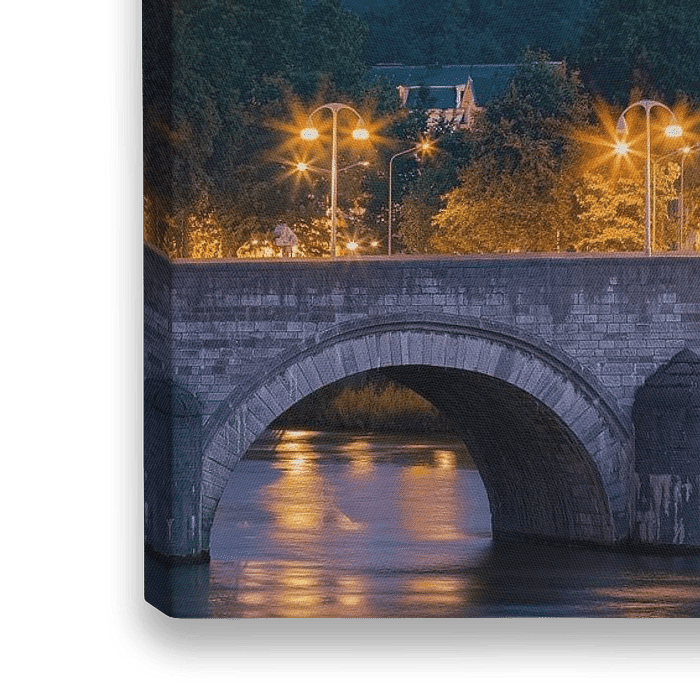 Een weids 2:1 panorama beeld van een avond tijdens schemering bij de verlichte Sint Servaasbrug (of de St. Servaasbrug), een gewelfde stenen voetgangersbrug over de Maas in Maastricht, Nederland.