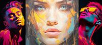 Panoramisch portret van een vrouw en twee mannen met geschilderde gezichten en zonnebrillen, bodypainting pop art ontwerp verticaal