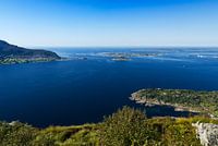 Fjordlandschap bij Ålesund in Noorwegen, vanaf de berg Sukkertoppen (Hessa).