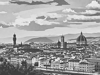 Deze afbeelding toont een panoramisch uitzicht op Florence, Italië, met iconische architecturale monumenten. De prominente bouwwerken zijn de kathedraal van Florence met zijn kenmerkende koepel en het Palazzo Vecchio met zijn hoge toren. Het stadsbeeld wordt geplaatst tegen een achtergrond van glooiende heuvels en een gedeeltelijk bewolkte lucht, waardoor de historische en culturele essentie van Florence wordt vastgelegd.