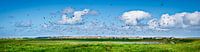 Panorama vanaf de waddendijk met een overzicht van Midsland. De foto is samengesteld uit meerdere afbeeldingen. In het middendeel van de foto scharrelen vele vogels.