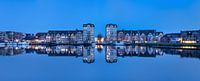 Panoramisch uitzicht op luxe appartementsgebouwen weerspiegeld in een gracht met jachten aan de Nieuwe Kaai Turnhout