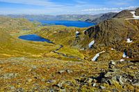 Een kale, maar toch zeer charmante natuur fascineert de reiziger op het Noordkaapse eiland Magerøya in het hoge noorden van Noorwegen, hier het uitzicht vanaf de pas tot aan de Skipsfjord. Nordkapp, Finnmark, Noorwegen. Opgenomen in de zomer van 2017.