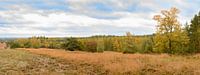 Berkenboom met gele bladeren en dennenbomen op de heide tijdens de herfst in het natuurgebied Veluwezoom op de Veluwe in Gelderland, Nederland. De bomen staan in een weids landschap met wolken in de lucht erboven.