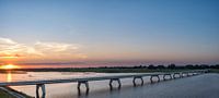 Zomerse zonsondergang over een brug over het Reevediep tijdens een prachtige zomeravond in augustus bij Kampen in Overijssel. Panorama uitzicht op grote hoogte.