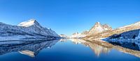 Panoramisch uitzicht over het Gryllefjorden op het eiland Senja in Noord Noorwegen tijdens een mooie winterdag. De besneeuwde bergen worden gereflecteerd in het kalme water van het fjord.