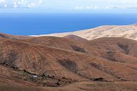 Panoramisch uitzicht vanaf het uitkijkpunt Mirador Morro Velosa op het vulkanische landschap in het binnenland van het Canarische eiland Fuerteventura met verschillende gekleurde bergformaties en de zee op de achtergrond.