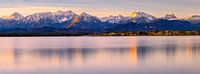 Het stille water van het meer weerspiegelt de gouden tinten van de opkomende zon, omgeven door zachte herfstkleuren en omlijst door de besneeuwde toppen van de Beierse Alpen.