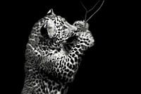 In het zwart wit omgezetten foto van een panter welp. De foto is bewerkt en heeft een schilders look gekregen.