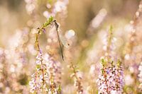Een rustende pantserjuffer in de bloeiende paarse pracht van de heide