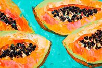 Koop dit schilderij Papajahelften op aquamarijnblauw - Levendig van Poster Art Shop als reproductie op canvas, aluminium dibond, (ingelijste) fotoprint, behang en ArtFrame, op maat geprint in Fine-Art kwaliteit.