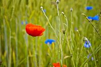 Rode papavers op een veld van tarwe. Blauwe korenbloemen zijn zichtbaar als een waas op de achtergrond. Het beeld is geschoten op een zonnige zomerdag.