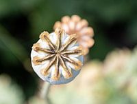 Prachtig bovenaanzicht van een ooit mooi rode klaproos, geworden tot papaver. Maakt een beeld dat spreekt tot verbeelding, kunstzinnigheid.