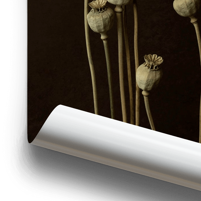 Een modern interieur is niet compleet zonder een botanische print. We zien hier de zaaddoos van de papaver. De kleuren en texturen van deze gedroogde plant zorgen samen voor een mooie weergave. De beige en bruine aardetinten vinden we terug in in veel verschillende interieurtrends.