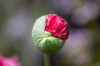 Knop van een papaverbloem op het punt van uitkomen. Rood met een paars roze achtergrond.