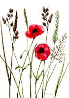 Deze aquarel is gebaseerd op prachtige klaprozen, omgeven door fijne grassen, liefdevol gereproduceerd in hun uniciteit in rode, bruine en groene tinten.