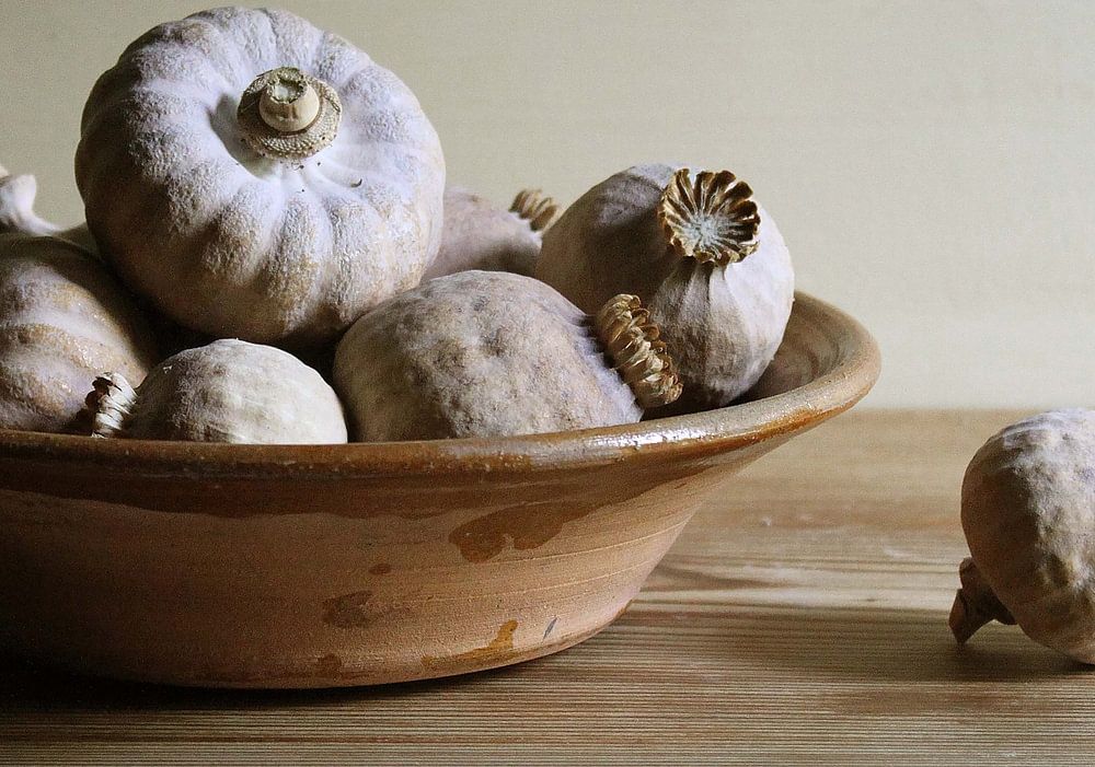 Bruin geglazuurde schaal met papaverbollen op houten tafelblad