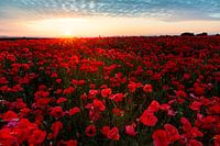 De opkomende zon overspoelt het papaverveld en laat het prachtig rood schijnen.