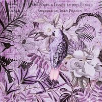 Papegaai in tropisch regenwoud in weelderige vegetatie met palmbomen en bloemen, monochrome illustratie in roze en paarse vrouwelijke pastelkleuren