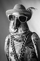 Een portret van een exotische papegaai, stijlvol gekleed met hoed en zonnebril, vastgelegd in een monochroom beeld.