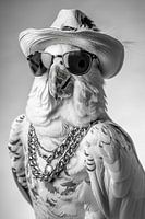 Een portret van een exotische papegaai, stijlvol gekleed met hoed en zonnebril, vastgelegd in een monochroom beeld.