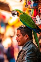 In een levendig moment van ontmoeting tussen mens en dier schittert een kleurrijke ara op het hoofd van een man, omgeven door een fascinerende marktsfeer. De heldere kleuren en authentieke verbinding creëren een ontspannen, tropische sfeer die ideaal is voor een woonkamer of een creatieve hoek van een kantoor.