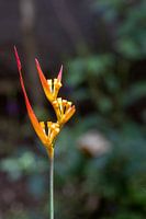De papegaai-bananenbloem met geelrode tot paarse bladeren voor een achtergrond met vele groene en bruine tinten van de bladeren van de struiken en bomen van het regenwoud van Costa Rica. Heel subtiel groeit deze prachtige bloem uit de bodem.