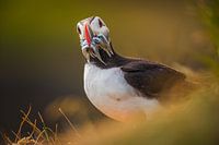 Portret van een Papegaaiduiker met de bek vol Zandalen. De vogel is op jacht geweest en is net teruggekeerd van zee. Hij wacht nog even voordat hij/zij de jongen gaat voeren, om te zien of ergens gevaar dreigt. De vogel kijkt in de richting van de camera, is vanaf de zijkant gefotografeerd en komt goed uit tegen een vage bruin/gele…