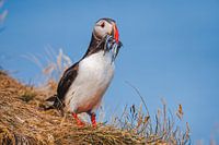 Dit werk is een portret van een papegaaiduiker die met z'n snavel vol zandaal in droog geel gras staat. Deze kleine visjes zijn het hoofdvoedsel van de Papegaaiduiker en deze foto is heel karakteristiek voor deze zeevogel. De Papegaaiduiker werd half van voren gefotografeerd in een broedkolonie in het oosten van IJsland. De grappige vogel komt goed uit tegen de blauwe vervaagde achtergrond gevormd door de zee.