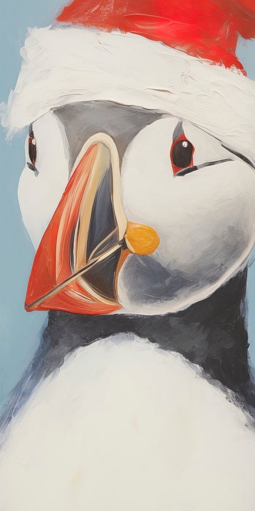 Een papegaaiduiker met een feestelijke kerstmuts. Breng de warmte van kerst in jouw huis met dit charmante werk!