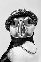 Deze indrukwekkende zwart-witfoto toont een papegaaiduiker in een modieuze outfit met hoed en bril. Een symbolische afbeelding met een vleugje humor.