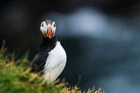 Deze papegaaiduiker kijkt mijn kant op, net nadat ik een prachtige foto had gemaakt terwijl hij vooruit keek. Het veertje in zijn bek zit vast, nadat hij zijn verenkleed had schoongemaakt.