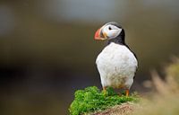 Papegaaiduiker staand op een rots bij Latrabjarg IJsland, hier broeden de papegaaiduikers