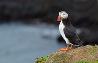 Papegaaiduiker staand en klaar om weg te vliegen van de hoge rots bij Latrabjarg IJsland