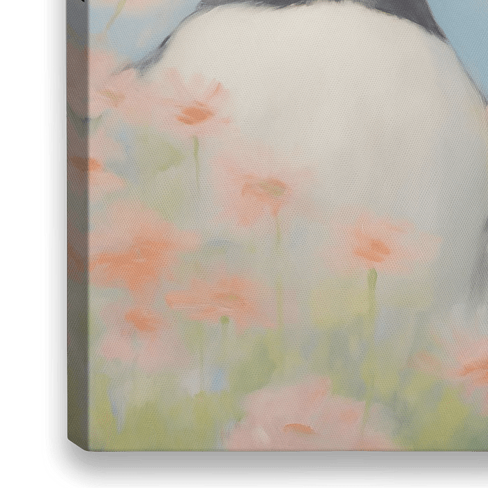 Een digitaal schilderij van een papegaaiduiker omringt door kleurrijke bloemen. Het werk geeft een dromerige en klassieke uitstraling aan uw interieur!