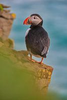 Een papegaaiduiker op de klif van Latrabjarg in IJsland, een klif waar duizenden vogels broeden.