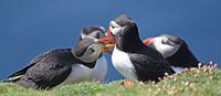 Papegaaiduikers zijn fraai en aandoenlijke vogels. Als je rustig ergens gaat zitten, komen ze vaak uit zichzelf dichterbij. Het gedrag dat ze op de foto vertonen heeft als doel de onderlinge band te verstevigen.
