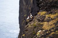 Deze foto van deze papegaaiduikers maakte ik in IJsland. De zwarte rotsen zorgen voor een mooie rustige zwarte achtergrond. Prachtige IJsland kunst. Ook is er nog een stukje van de zee in de achtergrond te zien.