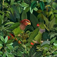 Exotische papegaaien in de tropische jungle met weelderige groene bladeren