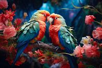 Twee papegaaien zitten dicht bij elkaar op een tak, omringd door een zee van roze bloemen. Hun felgekleurde veren en speelse houding brengen warmte, levendigheid en een vleugje exotische romantiek in elk interieur. Een kunstwerk dat direct de aandacht trekt en een vrolijke, tropische sfeer oproept.
