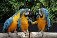 Deze Ara's hebben waarschijnlijk een meningsverschil en laten het duidelijk merken aan elkaar. Het lijken net mensen.
