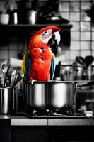 In het midden van een monochroom keukenlandschap rijst een felle ara majestueus op uit de kookpot - een wilde mix van kleuren en levensvreugde! Zijn levendige verenkleed steekt fel af tegen het effen metaal. Dit levendige kunstwerk brengt een vrolijke toets in de keuken en roept de charme op van een exotisch paradijs.